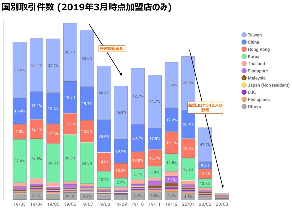 2020年1月27日発表された中国政府の団体旅行禁止以来、免税販売取引件数は右肩下がりを見せています。