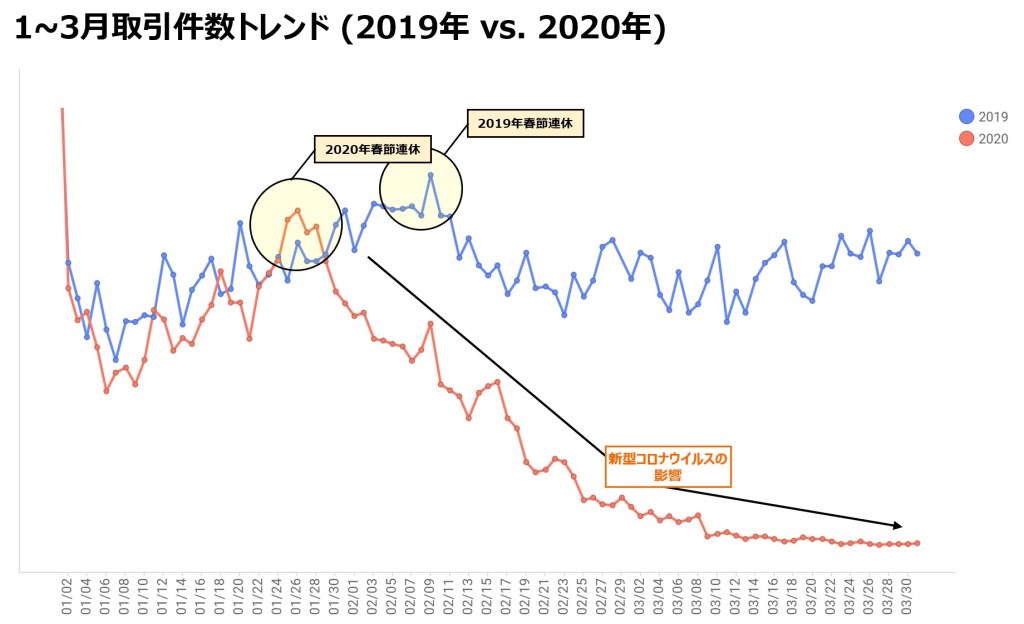 免税取引件数は2020年1月27日にピークに達した後、一方的に下がり続けている