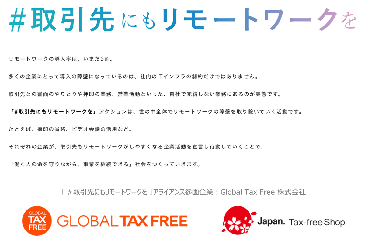 グローバル・タックスフリー株式会社(代表取締役:紀村 明、本社:東京都港区)は、リモートワークの実施に向けた課題の解決を目指す「 #取引先にもリモートワークを 」アライアンスの趣旨に賛同し、同アライアンスに参画いたします。