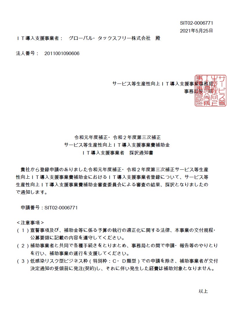 グローバル・タックスフリー株式会社(代表取締役:紀村 明、本社:東京都港区)は、下記の通り、IT導入支援事業者(2021年)として採択されました。