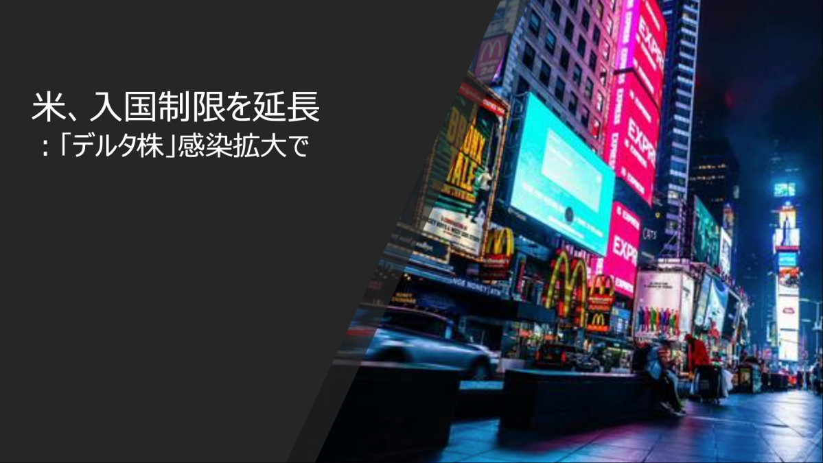 「デルタ株」の感染急拡大を受け、米ホワイトハウスのジェン・サキ報道官は、デルタ株の感染拡大防止のため、外国人旅行者の入国禁止措置を延長すると発表しています。航空会社や旅行業界から、夏のホリデーシーズンが終わるまでに制限を解除してほしいとの声があがる中、サキ報道官は、「感染力が強いデルタ株が国内外で拡大している」、「特にワクチンを接種していない人の間で感染が増加しており、今後数週間はその傾向が続くと見られる」と、延長の理由を述べました。